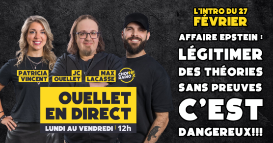 L’introduction du show du 26 février 2026. Une étude de l’UQAM révèle que les jeunes d’aujourd’hui afficheraient des comportements de plus en plus misogynes et homophobes, provoquant un débat animé chez les animateurs Jean-Francis Blais et Louis Gauvin sur les causes de ce phénomène. Ils évoquent un possible retour aux valeurs des années 60 et […]