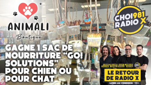 Cette semaine, écoute Le Retour de Radio X et tu pourrais gagner 1 sac de nourriture “Go! Solutions” pour chien ou pour chat, offert par Boutique Animali!