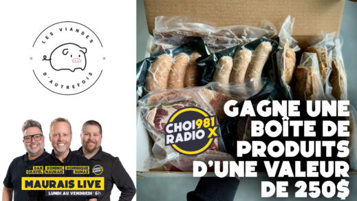 Une partie du porc est nommée en ondes et si tu textes la bonne réponse, tu deviens finaliste pour courir la chance de gagner une boîte découverte de 250 $ des Viandes d’Autrefois.