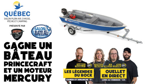 Dans le cadre du Salon Chasse, Pêche et Camping ainsi que du Salon du Bateau, tu pourrais gagner un bateau Princecraft avec un moteur Mercury d'une valeur de 12 000$!